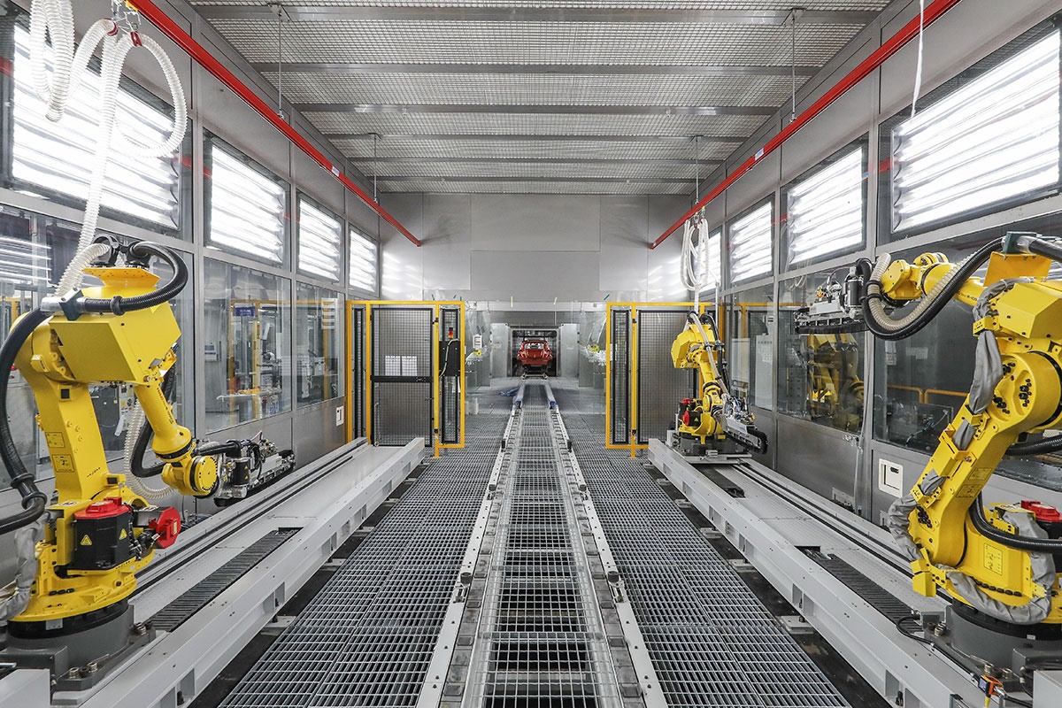 The painting capacity is 60 vehicles per hour and up to 280,000 vehicles per year. Capable of processing various vehicle types, the paint shop has secured a range of techniques including two-toned coating. In the new paint shop, which is equipped with eco-friendly facilities, all of the key processes are automated.
