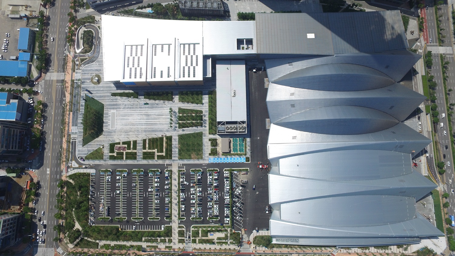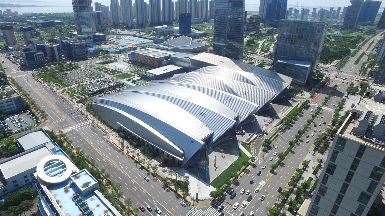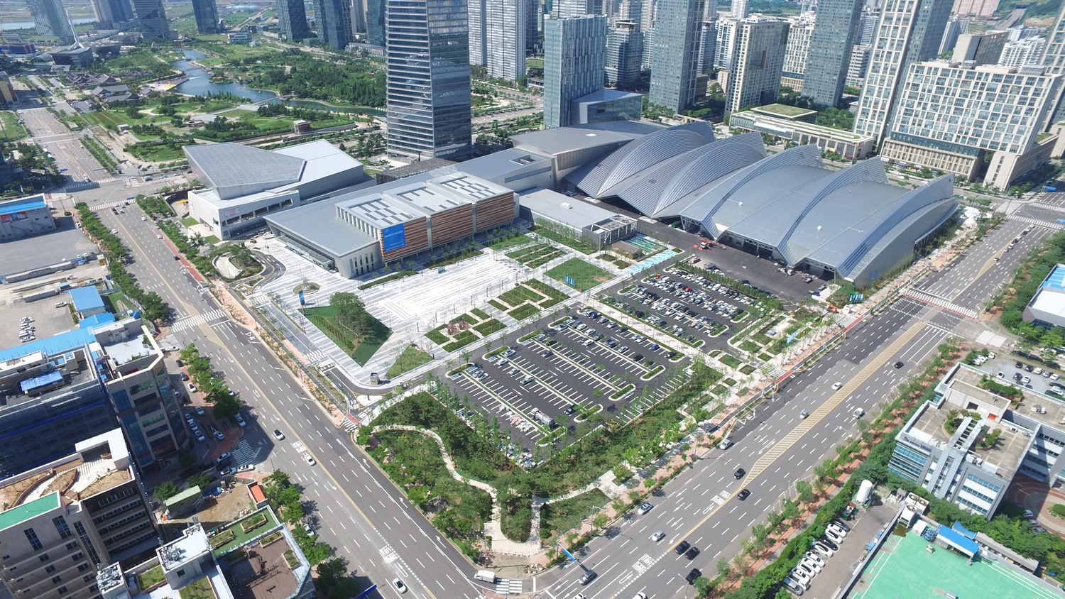 Situated in only a 25-minute distance from Incheon International Airport, Songdo Convensia is adjacent to hotels, a shopping mall, international organizations, and leading industrial facilities. As such, Songdo Convensia has optimal geographical conditions. The roof of Songdo Convensia was designed to resemble Korea’s mountain range. The large exhibition hall without pillars is a representative feature of Songdo Convensia.