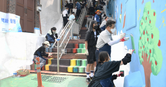As part of its project in improving the environments of deprived regions, more than 60 employees of POSCO E&C volunteered to decorate Baedari Village in Dong-gu, Incheon. They used a trick-art method to paint a bookshelf filled with books on a stairway in the village to represent the Old Book Street, the symbol of Incheon. The wall painting volunteer group also refurbished an old dog shelter located in Dangjin, Chungcheongnam-do. They engaged in renovating the interior, installing fences outside, and decorating the exterior with wall paintings of animals, adding vibrance and friendliness to the shelter.