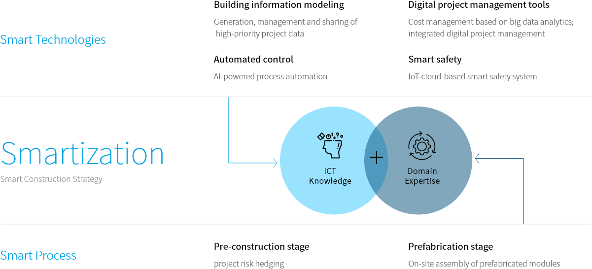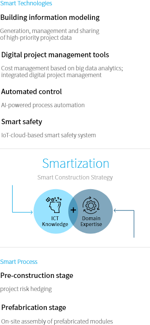 From the planning to construction phase of a project, a wide range of digital solutions such as building information modeling (BIM), smart tools, prefabrication applications, and pre-construction smart workflows are applied. Our Smart Construction Group harnesses the power of AI and data to standardize work processes. The Group also internalizes the latest technical knowledge through staff training programs and technology acquisition.