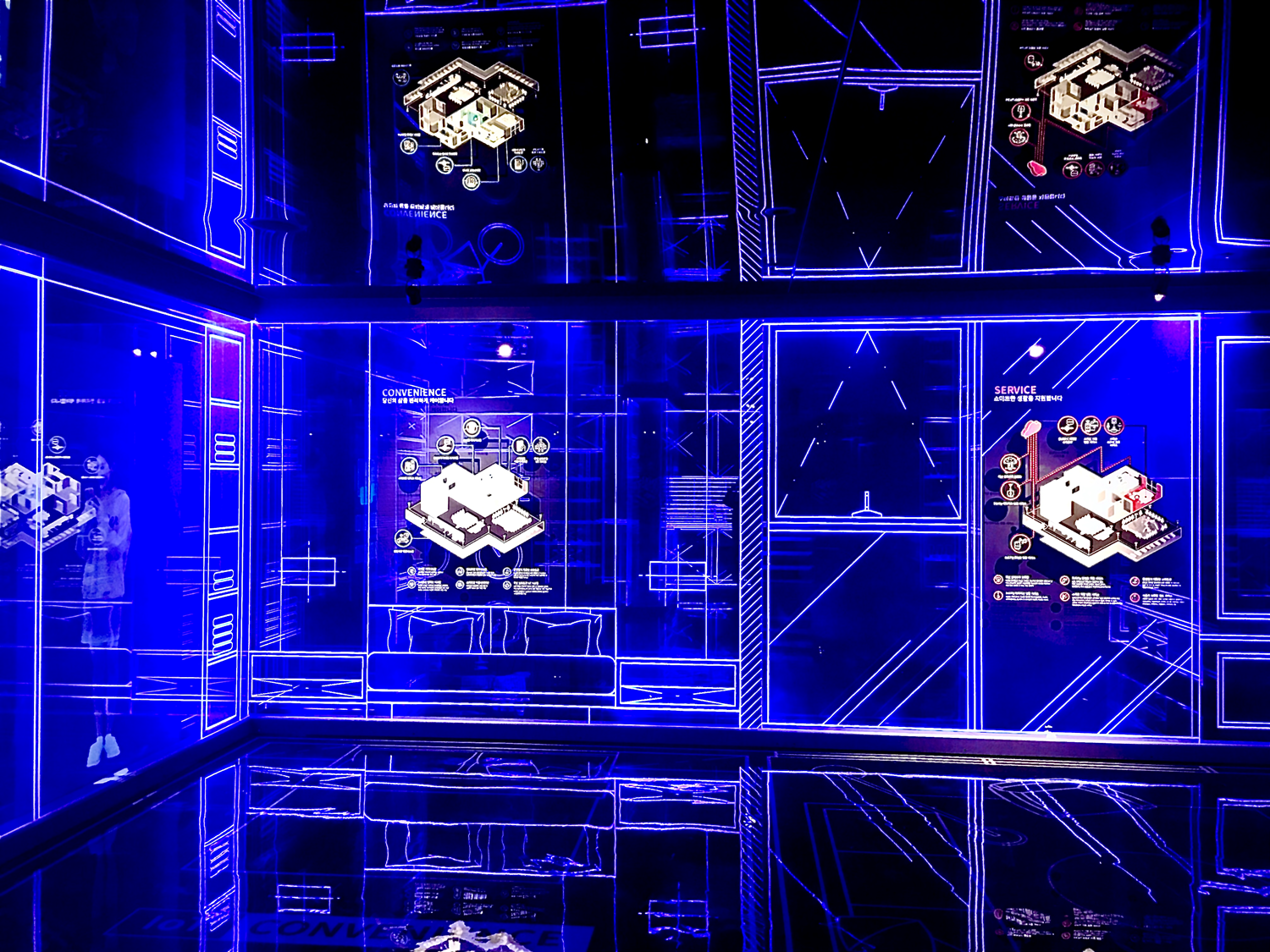연면적 4,966㎡에 3층 규모인 더샵갤러리는 건물 자체가 하나의 커다란 건축용 철강재 종합전시관인 동시에 포스코그룹의 철강, IT, 건설 관련 기업들이 힘을 보탬으로써 그룹 차원의 강건재 및 건축 홍보관의 면모를 보여주고 있습니다. 홍보관의 건축설계는 포스코 A&C가 담당했고, 내·외부 주요 마감재는 포스코와 포스코강판이 최근 개발한 제품을 적용했습니다. 스마트홈 관련 시스템의 장비와 운용기술은 포스코DX가 공급한 것이며, 시설관리는 포스코 O&M이 담당하고 있습니다.