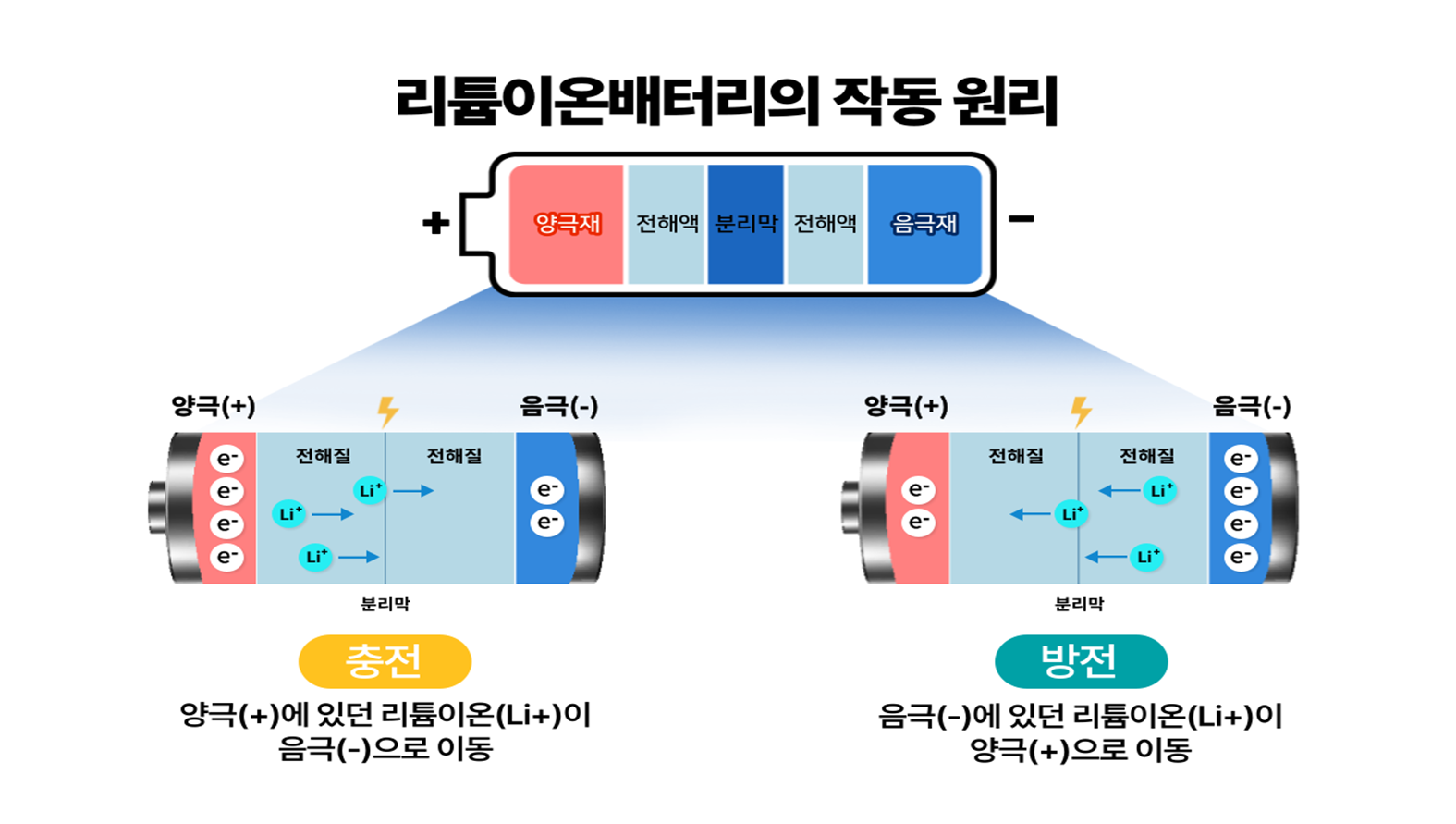 다시 말해 양극의 리튬 이온이 음극으로 이동하면 배터리가 충전되고, 반대로 음극의 리튬 이온이 양극으로 돌아가면 배터리가 방전되는 원리입니다.