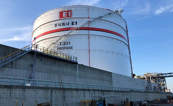 대산 E1 LPG 탱크 건설 공사는 4만톤 규모의 LPG 탱크 및 부대 설비를 신설하는 공사로 대산 석유화학단지 내 석유화학사에 LPG를 안정적으로 공급하는 역할을 하고 있습니다. 포스코이앤씨는 설계/설비공급/시공을 일괄 수행하여 기술력을 널리 알리게 된 사업입니다.