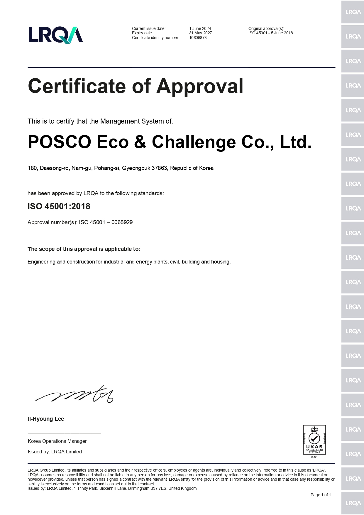 포스코이앤씨는 2018년 6월, 국내 건설사 최초로 국제표준 안전보건