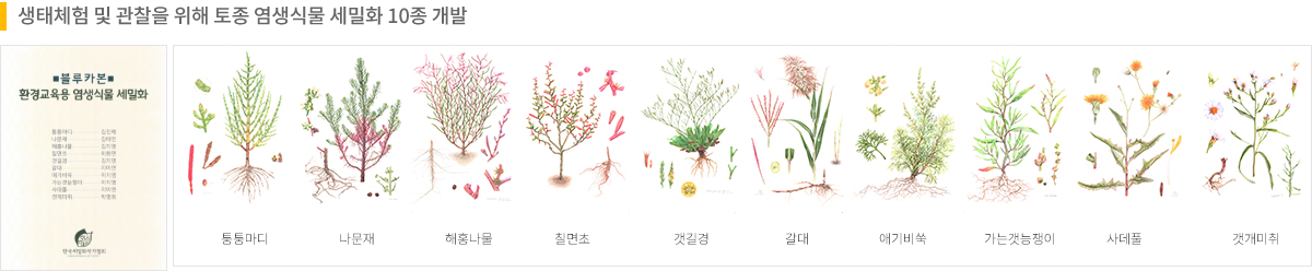 또한 국내 토종 염생식물을 세밀화로 제작해 시민과 청소년을 위해 전시하고 군락지 생태 체험에 활용하여 미래세대를 위한 환경교육 교재로 적극 활용하고 있습니다.